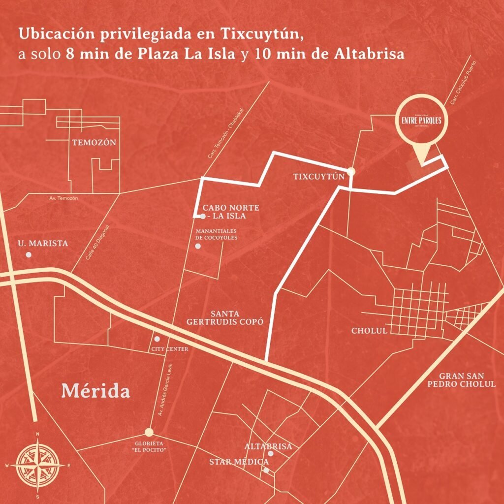 Entre parques se encuentra ubicado al norte de la ciudad de Mérida, en la zona de Tixcuytún, a corta distancia de las principales zonas comerciales y de servicio, pero a su vez apartada de la ciudad, rodeada de naturaleza y amenidades.