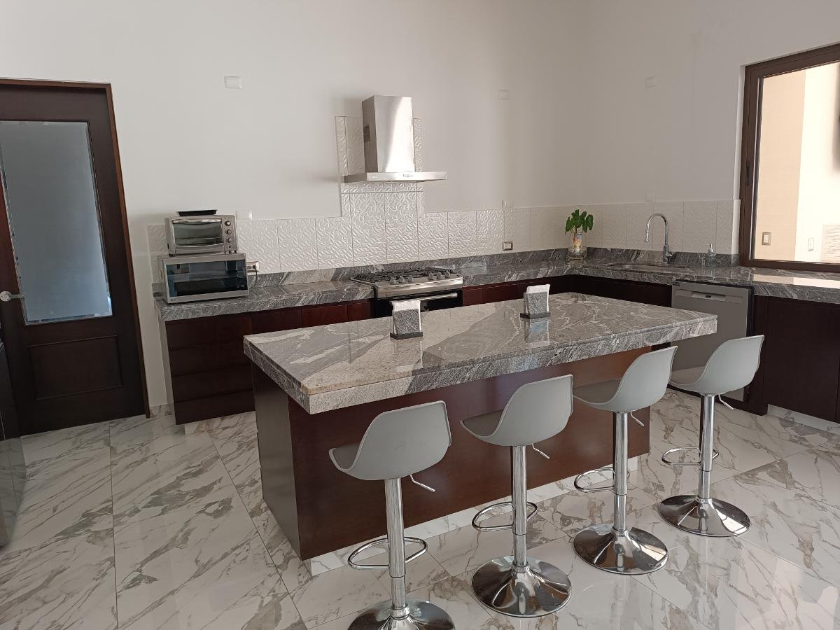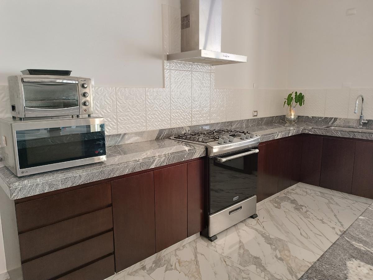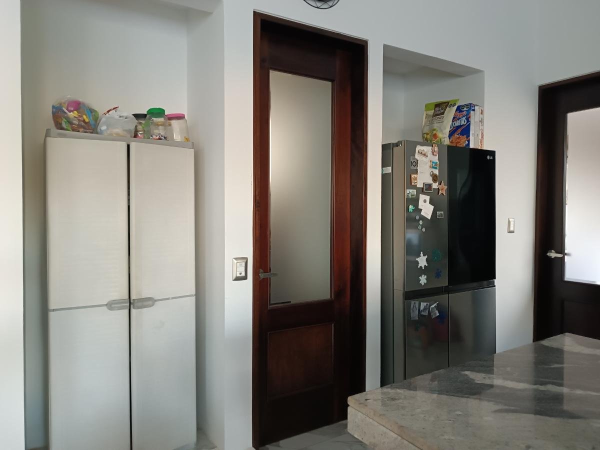 - Amplio espacio corrido con aire acondicionado (A.A.) inverter y vista a la alberca de: sala, comedor y cocina (con lavavajillas y alacena).