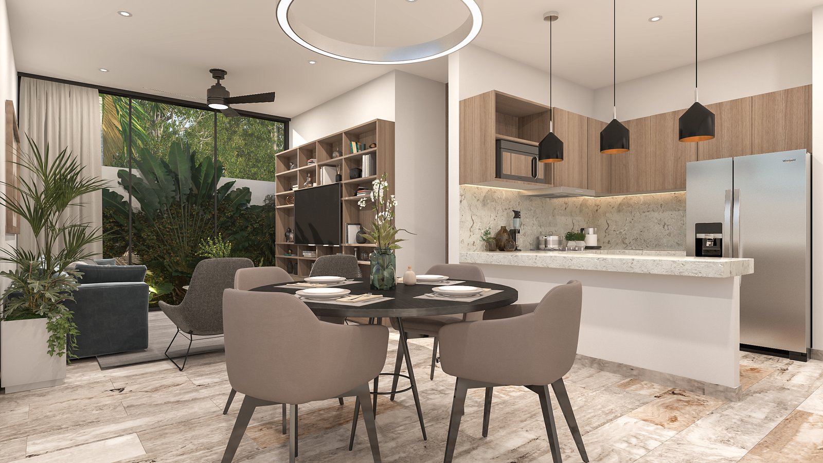 • Espacios integrados: Sala y comedor con diseño funcional y estético.